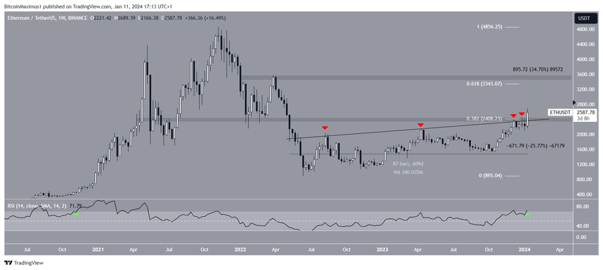 Po czterech nieudanych próbach (czerwone ikony), cena ETH w końcu przebiła się w tym tygodniu, osiągając szczyt na poziomie 2689 USD. W momencie wybicia linia trendu znajdowała się w miejscu od ponad 600 dni.