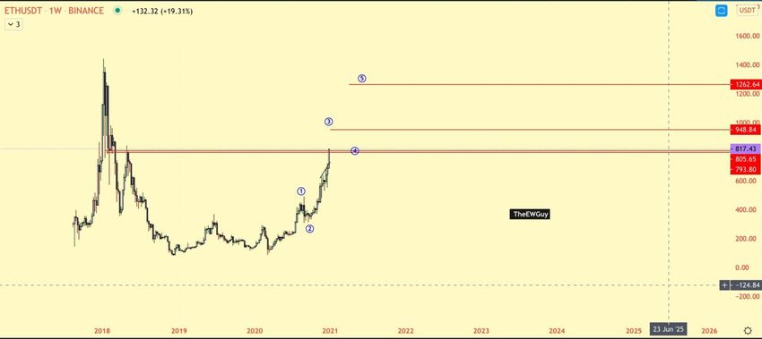Kryptowalutowy trader @TheEWguy przedstawił wykres ETH, w którym stwierdził, że cena jest w rozszerzonej trzeciej fali i prawdopodobnie będzie nadal rosnąć powyżej 1000 USD.