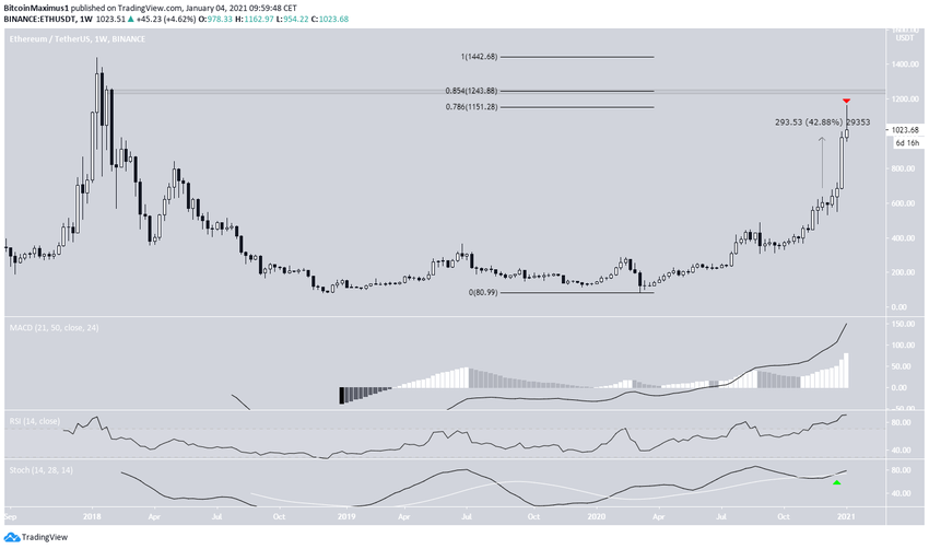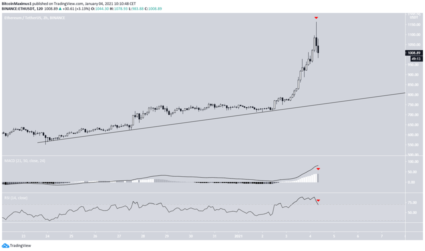 Cena ETH znacznie wzrosła w ciągu tygodnia od 27 grudnia do 4 stycznia, bo o prawie 43%. ETH kontynuował dziś wzrost, osiągając szczyt na poziomie 1162,97 USD. Jednak wyższych cen nie można było utrzymać, a ETH stworzył długi górny knot i spadł poniżej 1000 USD.