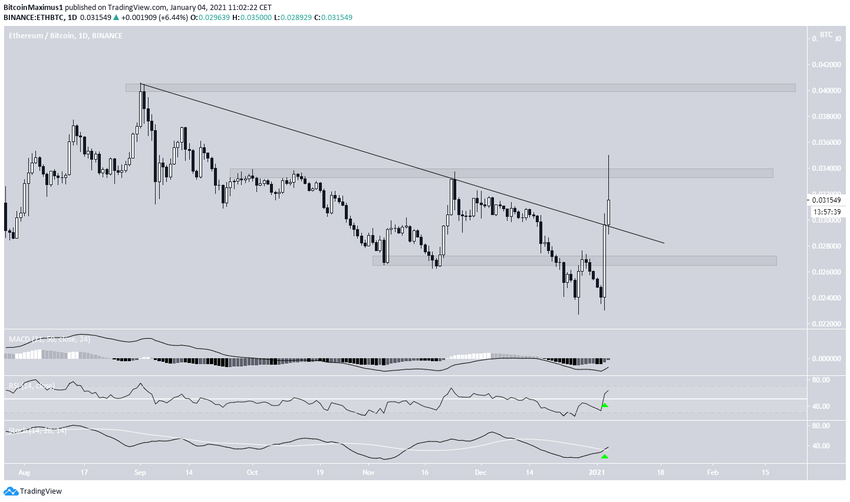 Wykres ETH/BTC jest byczy, ponieważ pokazuje odzyskanie obszaru 0,027 BTC, a następnie wybicie z opadającej linii oporu.