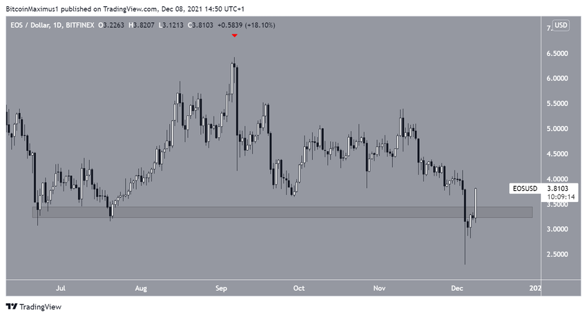 EOS spada od dnia 6 września. Początkowo ruch spadkowy został zatrzymany w pobliżu obszaru horyzontalnego na 3,30 USD. Jednak w dniu 4 grudnia EOS się załamał.