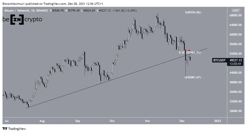 Bitcoin (BTC) od początku lipca podążał za wznoszącą się linią wsparcia. W dniu 4 grudnia załamał się z tej linii i dotarł do dołka na poziomie 42 000 USD.