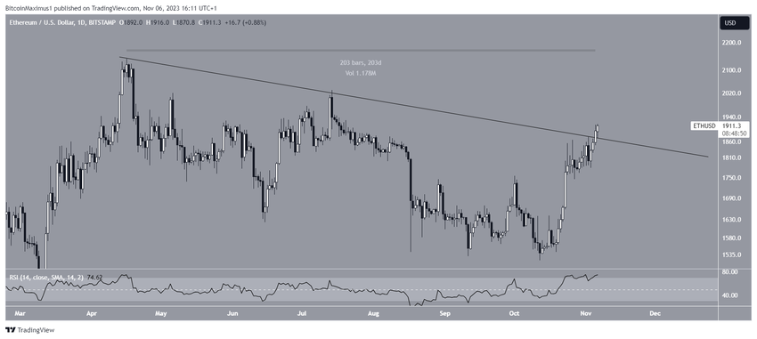W dniu 5 listopada, po 203 dniach spadku poniżej opadającej linii trendu oporu, cena Ethereum w końcu się wybiła. Tego samego dnia osiągnęła nowy roczny szczyt na poziomie 1916 USD.