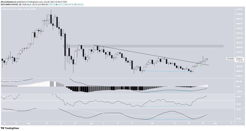 Wykres dzienny rzeczywiście wygląda bardziej byczo. Ethereum utworzyło formację podwójnego dna, która była połączona z byczymi dywergencjami na oscylatorze MACD, RSI i stochastycznym.