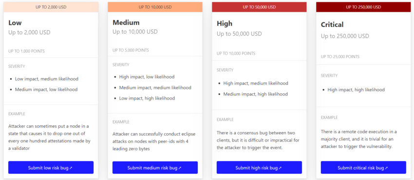 Jednak w chwili pisania tego tekstu, strona z nagrodami ustaliła maksymalną nagrodę na 250 000 dolarów. Jest to nagroda, którą są skłonni rozdać za zdalny atak, na który narażona jest większość popularnych klientów protokołu Ethereum.