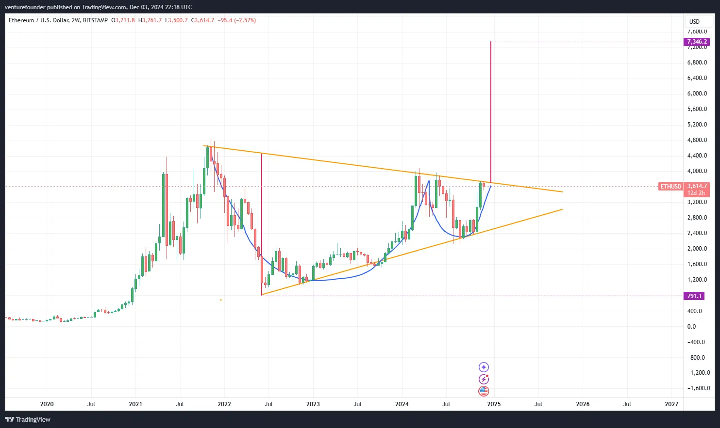 Ethereum (ETH) odnotowuje silny wzrost, z ceną rosnącą z 2400 USD do 3700 USD w ostatnich tygodniach. Ten skok przyciągnął uwagę traderów i inwestorów, wzbudzając optymizm co do przyszłości ETH. Jednak według pseudonimowego analityka VentureFounder, Ethereum jest gotowe na jeszcze większy wzrost, potencjalnie osiągając 7346 USD.