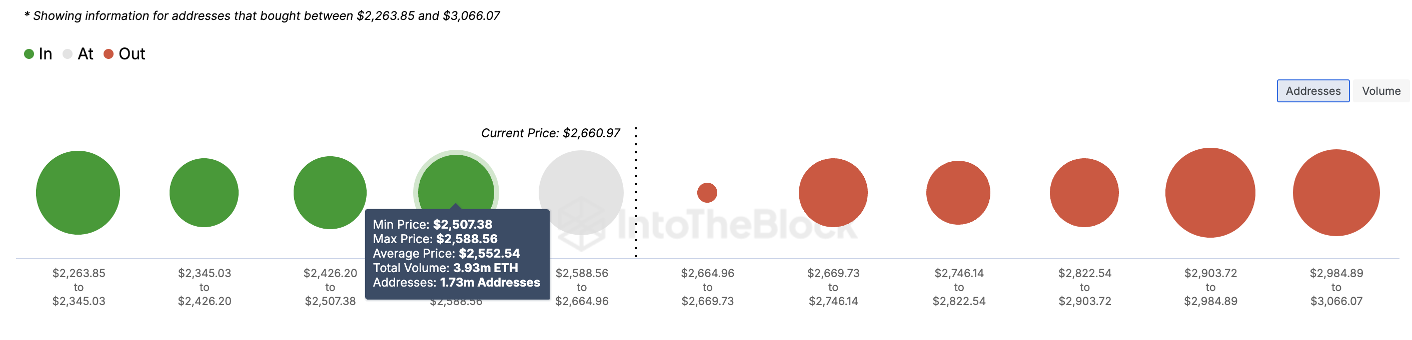 Według IntoTheBlock 1,73 miliona adresów zakupiło 3,93 mln ETH po średniej cenie 2552 USD. Liczba tych adresów jest większa niż tych, którzy ponieśli straty między 2699 USD a 2867 USD.