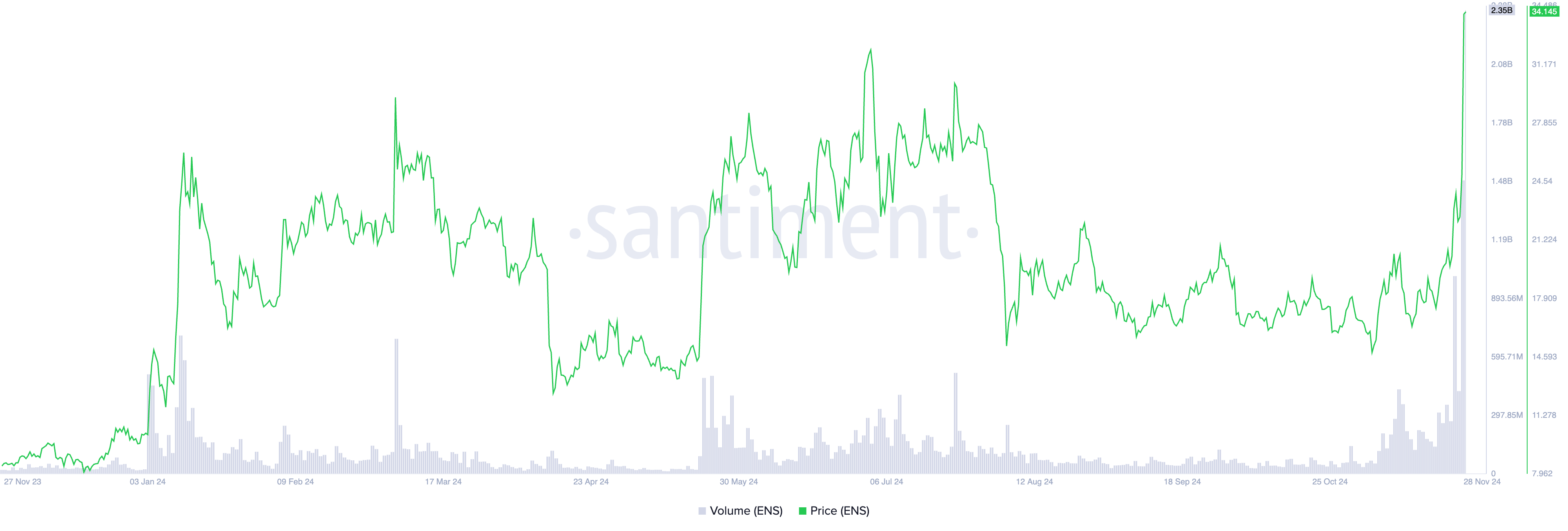 Znaczący wzrost wolumenu handlu towarzyszył dwucyfrowemu wzrostowi ENS. Wolumen osiągnął rekordowy poziom 2,35 mld USD, wzrastając o ponad 300% w ciągu ostatnich 24 godzin.