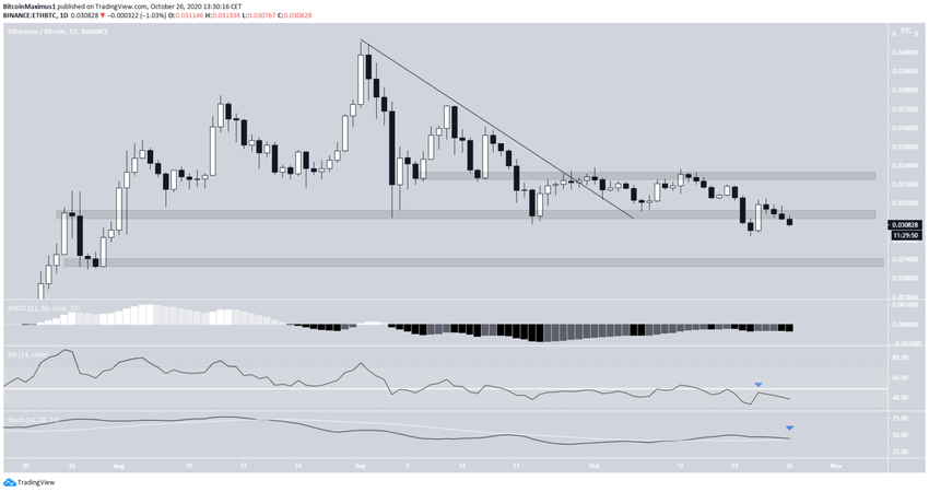 Wykres ETH/BTC wygląda bardziej niedźwiedzio niż jego odpowiednik ETH/USD. Chociaż ETH początkowo wybił się z opadającej linii oporu, to nie był w stanie utrzymać wyższych cen.