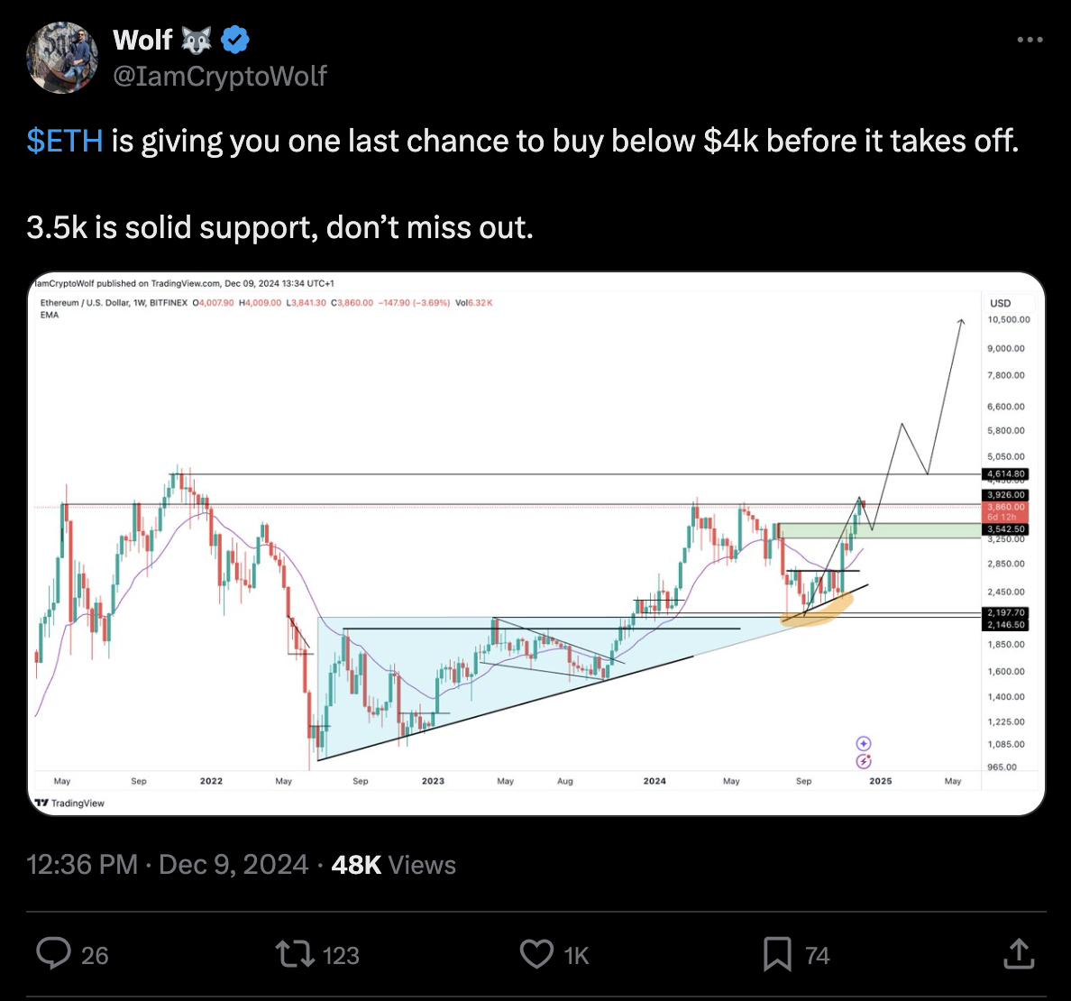 Doświadczony analityk kryptowalut z platformy X pod pseudonimem Wolf, jest znany z dzielenia się swoimi spostrzeżeniami na temat rynku kryptowalut. Tymczasem, BeInCrypto przyjrzało się jednym z ostatnich wpisów tego krypto-entuzjasty, który zasugerował w nim, że Ethereum (ETH), które jest wyceniane poniżej poziomu 4000 USD, może wkrótce go przekroczyć. To stanowiłoby istotny wzrost w porównaniu z obecną ceną.