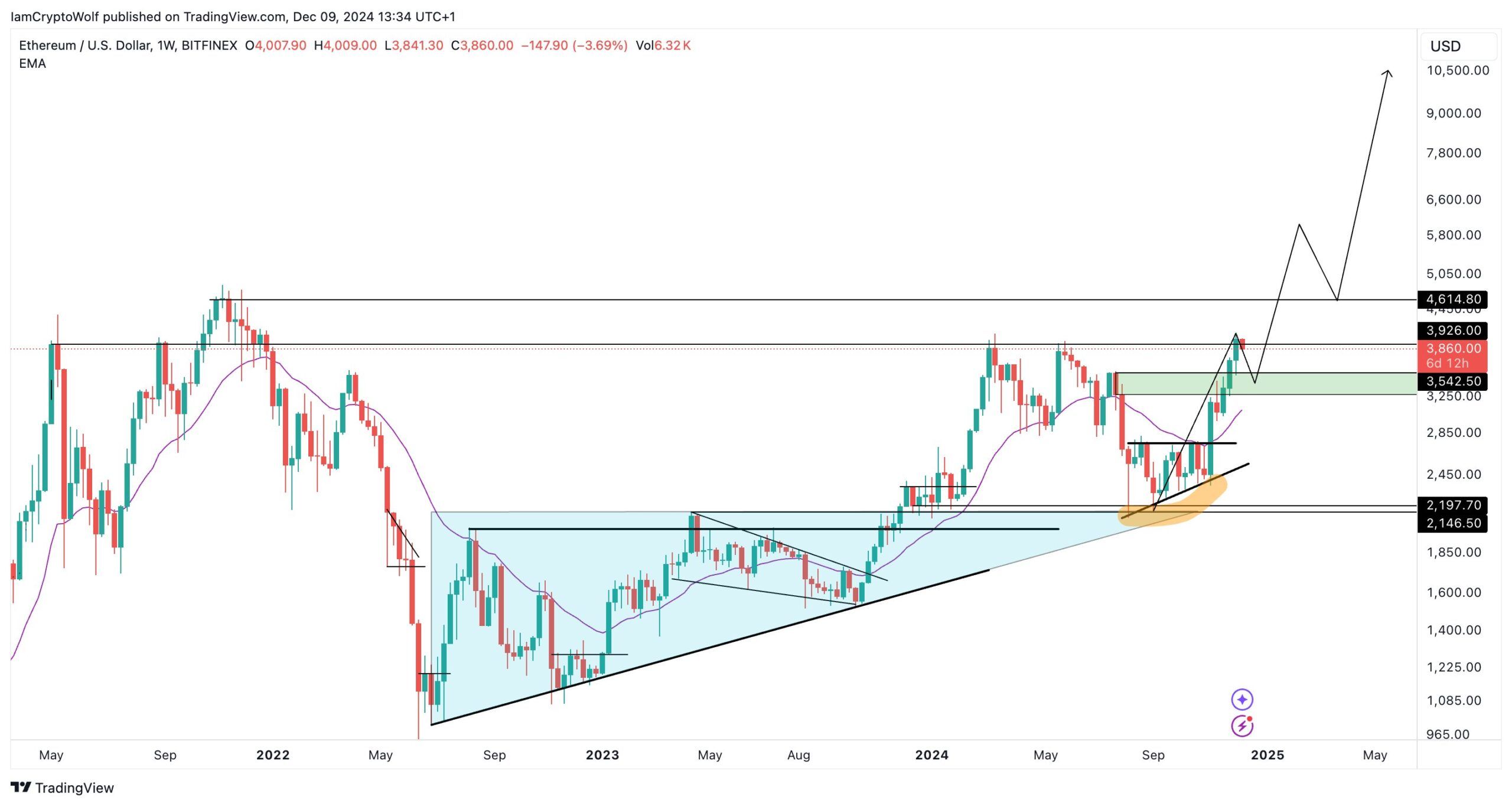 Obecnie Ethereum notowane jest na poziomie około 3753 dolarów, co oznacza skromny wzrost o 1,23% od rozpoczęcia dzisiejszej sesji w momencie pisania tekstu. Pomimo ostatniego spowolnienia wzrostu tego altcoina, analityk Wolf, pozostaje optymistyczny co do przyszłości tej kryptowaluty. W krótkim wpisie na swoim koncie na platformie X, Wolf oznajmił:
