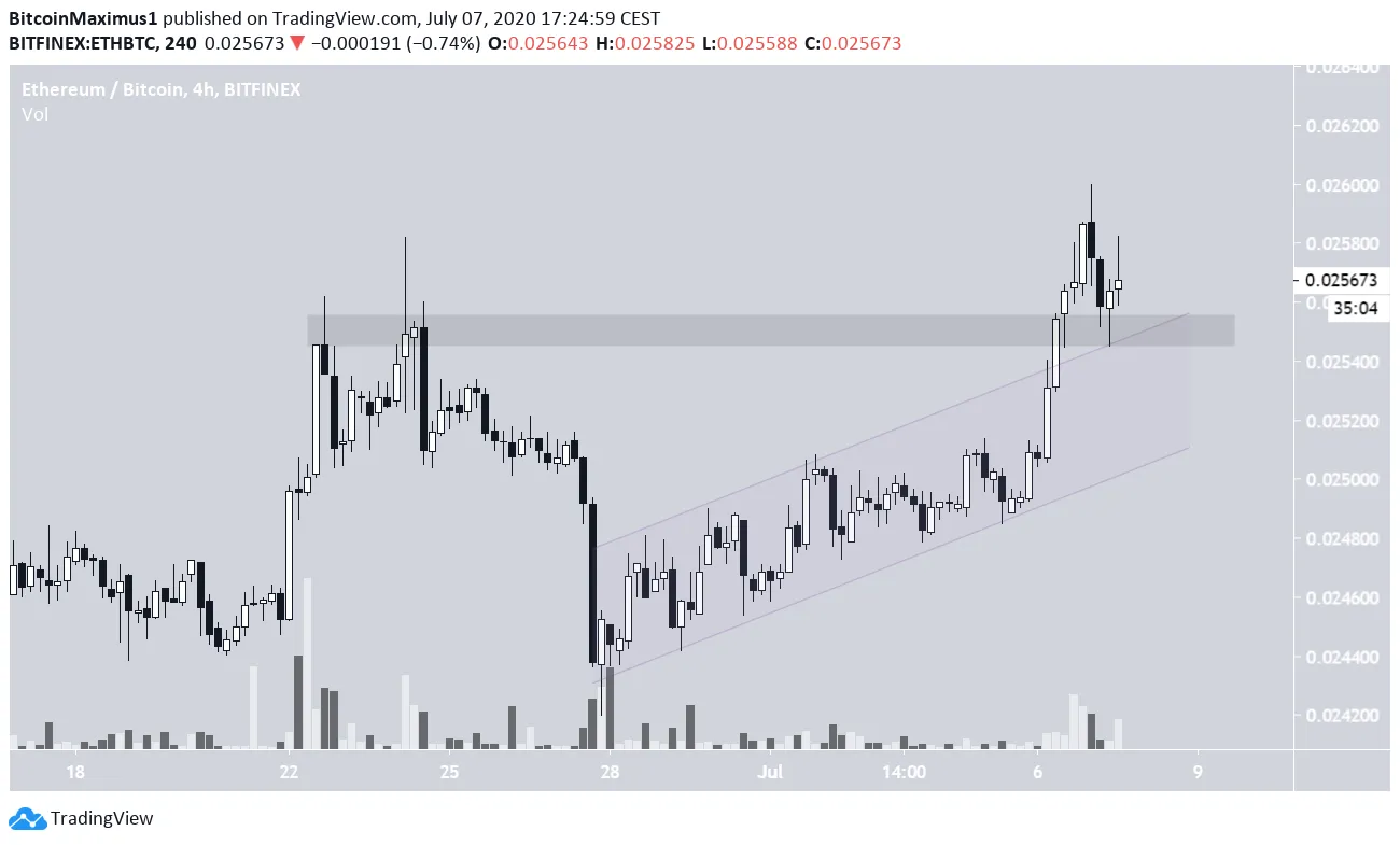 Wykres godzinowy ukazuje byczą perspektywę. Ethereum wydostało się z rosnącego kanału, a następnie odzyskało poprzedni obszar oporu na 0,0255 satoshi jako wsparcie. ETH potwierdziło też linię oporu w kanale jako wsparcie.
