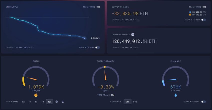 Według trackera Ethereum Ultrasound.Money, wzrost podaży w ciągu ostatniego miesiąca wyniósł -0,33%. W krótszym, dziennym przedziale czasowym deflacja jest w tej chwili bliższa -0,5%.