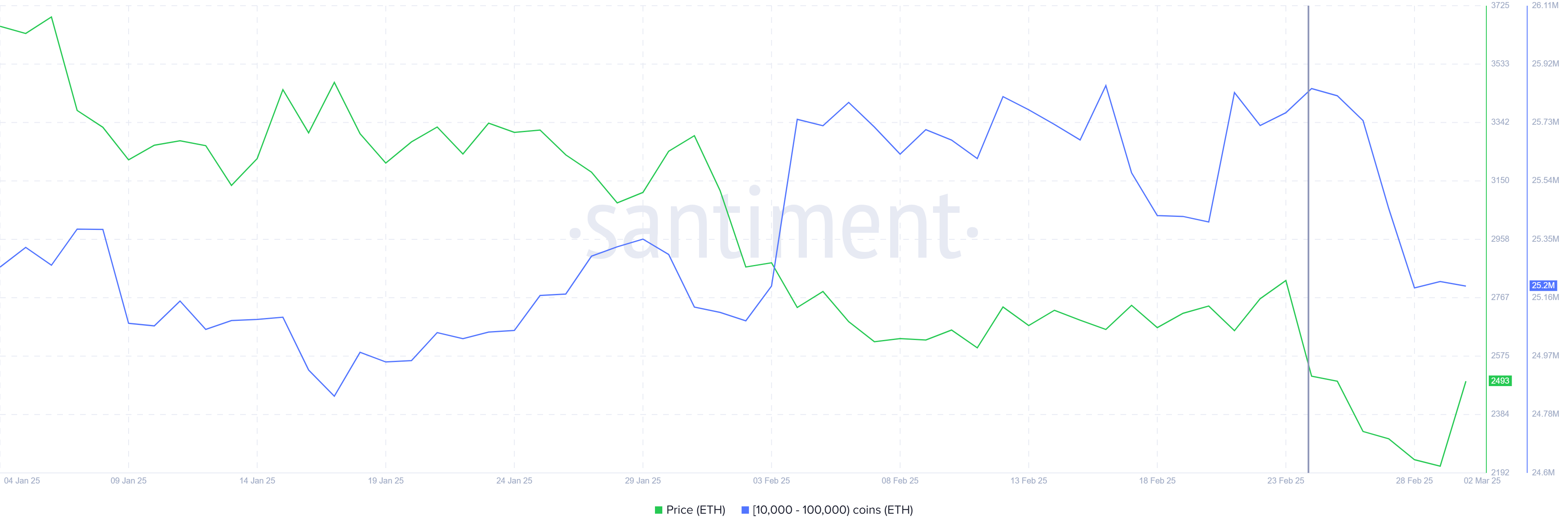 Adresy wielorybów, posiadające od 10 000 do 100 000 ETH, sprzedawały agresywnie. W ciągu ostatniego tygodnia wyprzedały 640 000 ETH o wartości 1,5 mld USD, co przyczyniło się do problemów Ethereum w pobliżu 2500 USD. Jednak presja sprzedażowa osłabła, co sygnalizuje zmianę nastrojów.