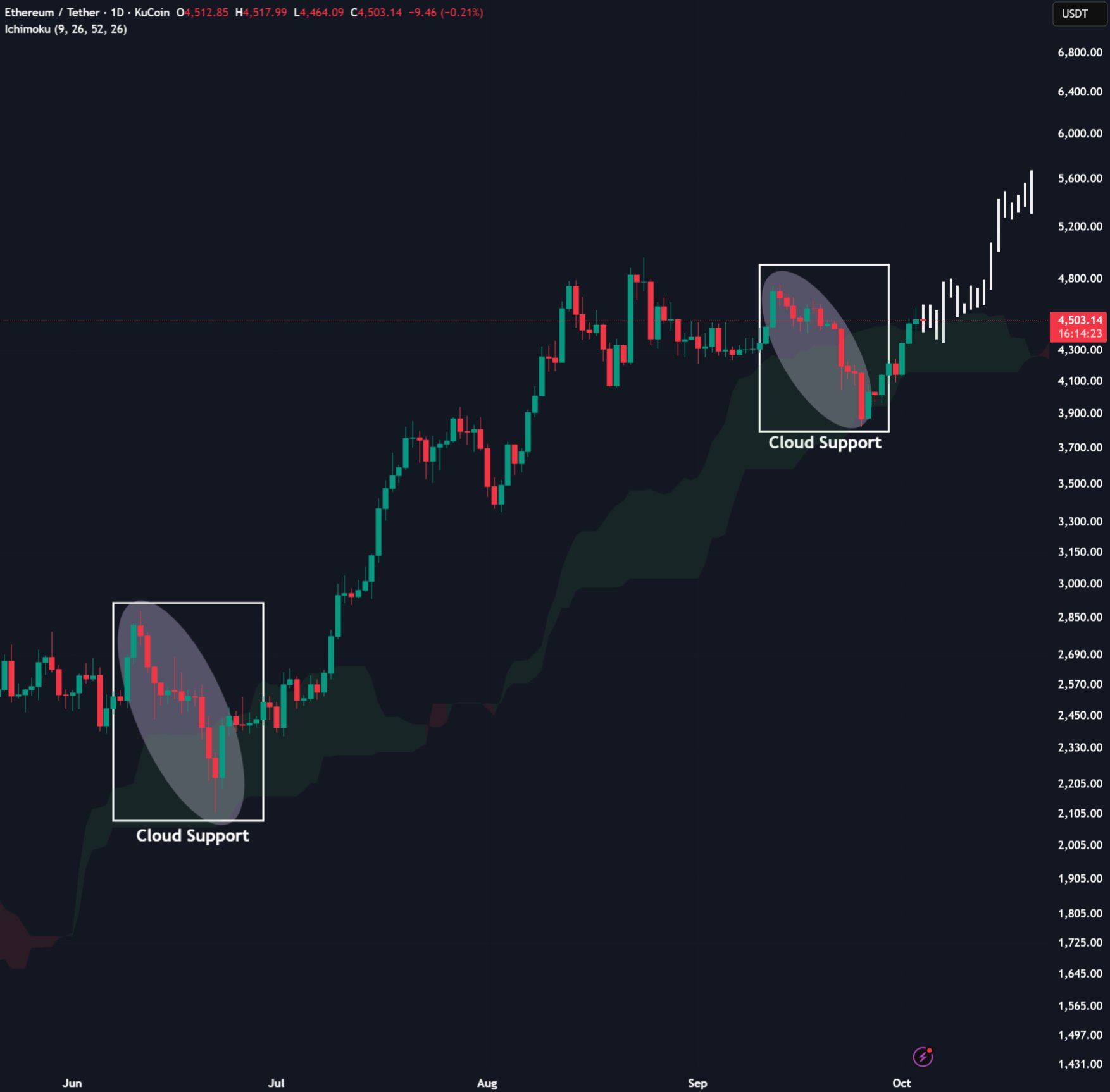 Co ważne, sygnały wzrostowe potwierdzają też inne wskaźniki. Analityk ZYN zauważa, że Ethereum odbiło od kluczowego wsparcia w chmurze Ichimoku. Dopóki ta strefa się utrzymuje, nie ma powodów do obaw o trend. Dynamika pozostaje po stronie byków, a dalsze wzrosty mogą być tylko kwestią czasu.