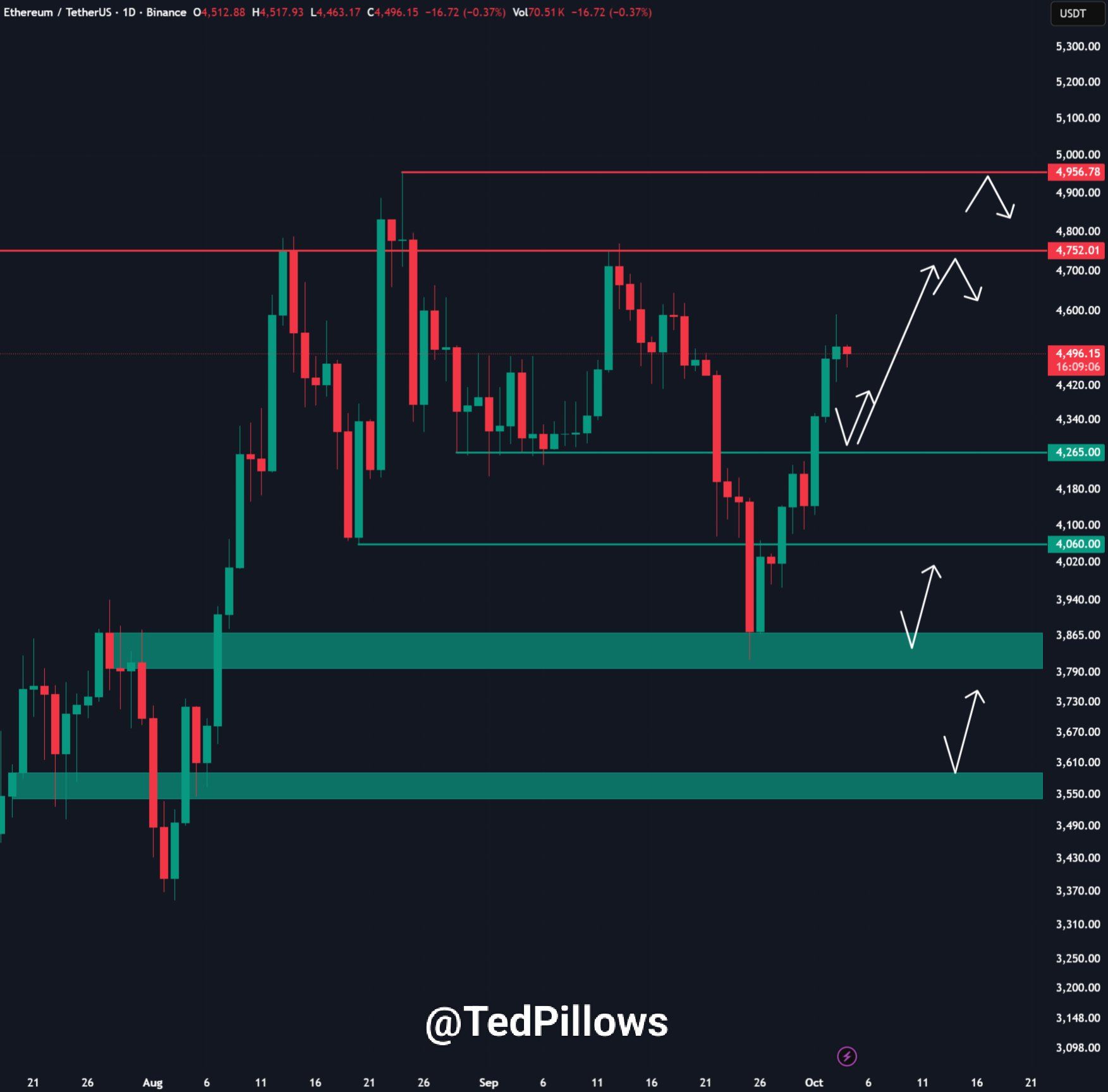 Podobne spojrzenie na sytuację ETH ma analityk Ted, który zwraca uwagę, że obecna cena Ethereum utrzymuje się w rejonie 4500 USD. To istotny punkt równowagi między kupującymi a sprzedającymi. Kolejny ważny opór znajduje się na poziomie 4750 USD – jego przełamanie może otworzyć drogę w stronę nowych historycznych poziomów (ATH). Ted w swoim wpisie na X napisał: