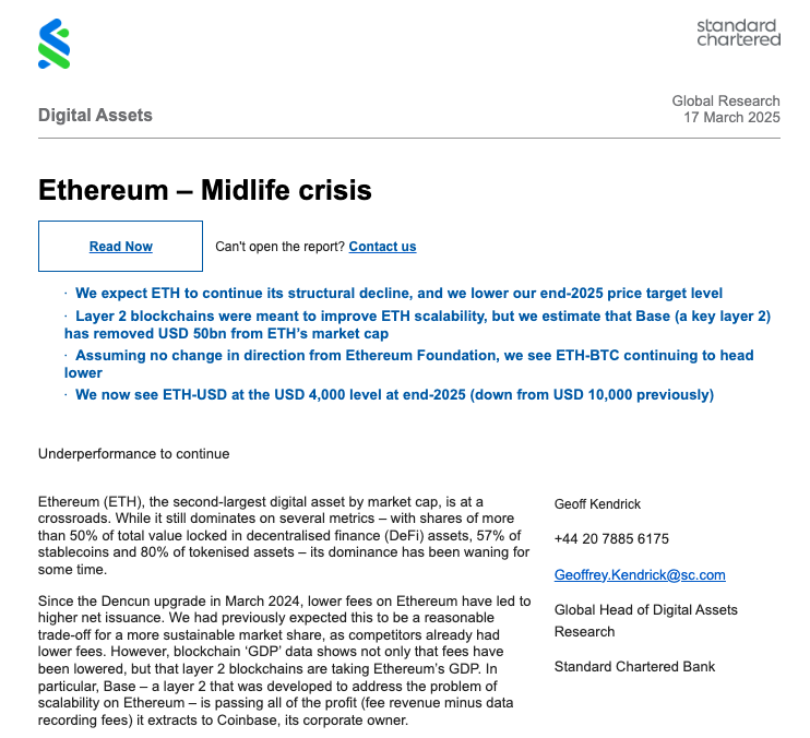 Ethereum w tarapatach – tak można podsumować najnowsze prognozy Standard Chartered, które obniżyły oczekiwaną cenę ETH na 2025 rok o 60%. Bank przewiduje, że Ethereum osiągnie jedynie 4000 USD do końca roku, co jest drastycznym spadkiem względem wcześniejszych oczekiwań. Spadek wartości ETH budzi obawy wśród inwestorów i analityków.