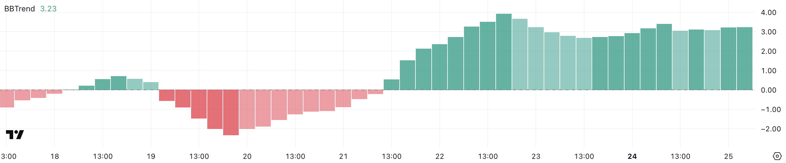 Ostatni raz BBTrend przekroczył poziom 5—zwykle związany z silnymi warunkami trendowymi—26 lutego, prawie miesiąc temu. Od tego czasu wskaźnik wykazuje umiarkowaną siłę, ale jeszcze nie wszedł w strefę wysokiego impetu.