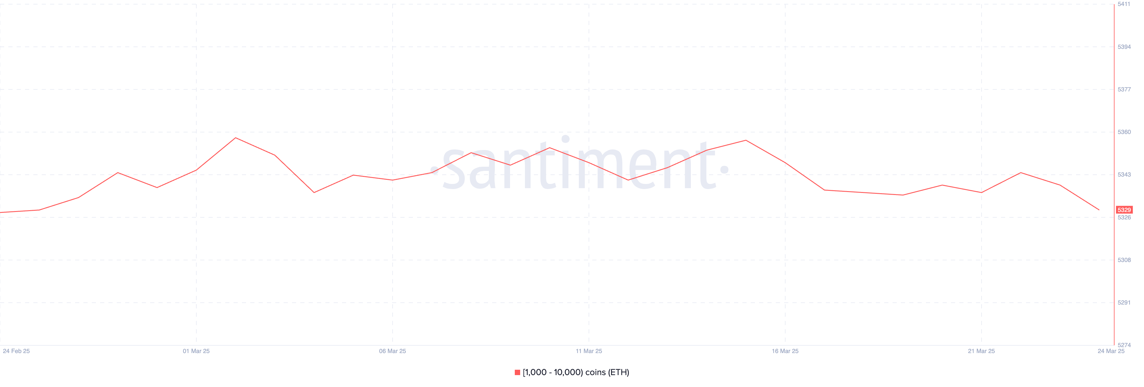 Liczba wielorybów Ethereum—portfeli posiadających od 1000 do 10 000 ETH—spadła do 5329, z 5344 zaledwie trzy dni temu.