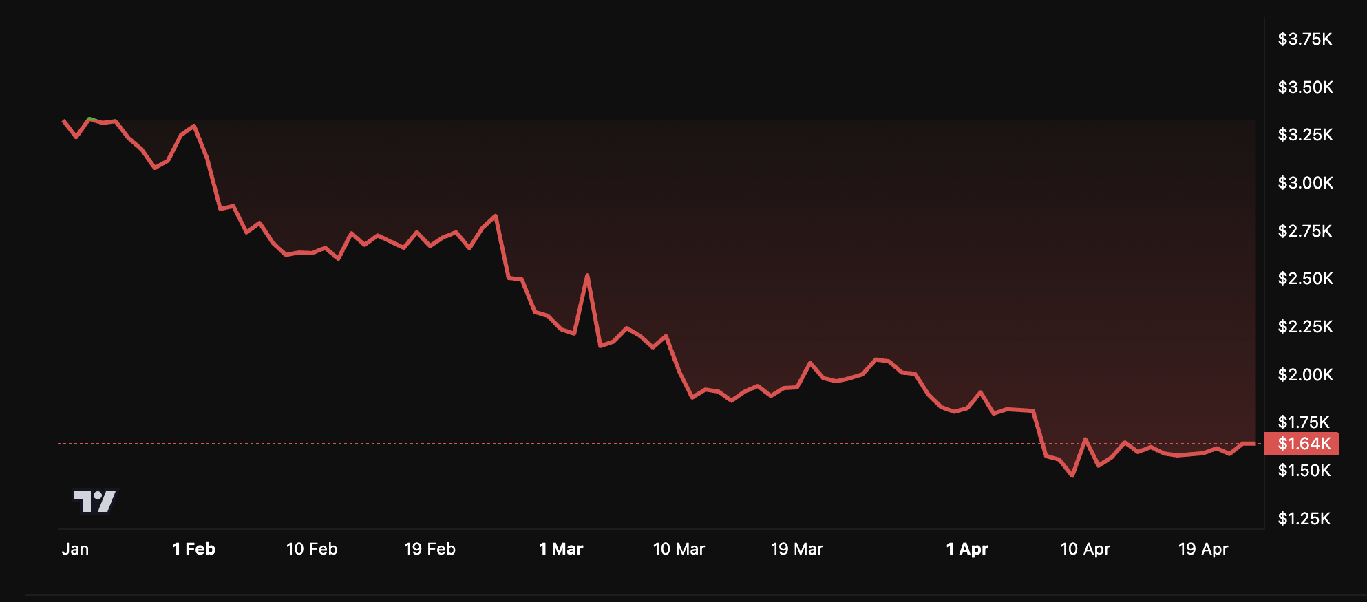 Jednak dane od BeInCrypto pokazały niewielkie ożywienie w ciągu ostatnich 14 dni. ETH wzrosło o 6,1%. W ciągu ostatniego dnia odnotowano skromne zyski na poziomie 1,7%. W momencie pisania tego tekstu ETH kosztowało 1639 USD.