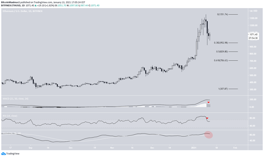 Pomimo spadku, długoterminowe wskaźniki ETH są nadal zwyżkowe, co sugeruje, że oczekuje się kontynuacji ruchu w górę. Jednak ze względu na szybkie tempo wzrostu najbliższy obszar wsparcia znajduje się na poziomie 800 USD.