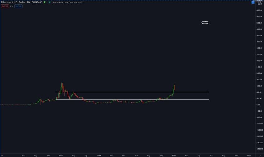 Kryptowalutowy trader @Cryptotrooper_ opublikował na Twitterze wykres pokazujący, że ETH przekroczył poprzedni obszar oporu na 800 USD i wyznaczył cel na 5200 USD.