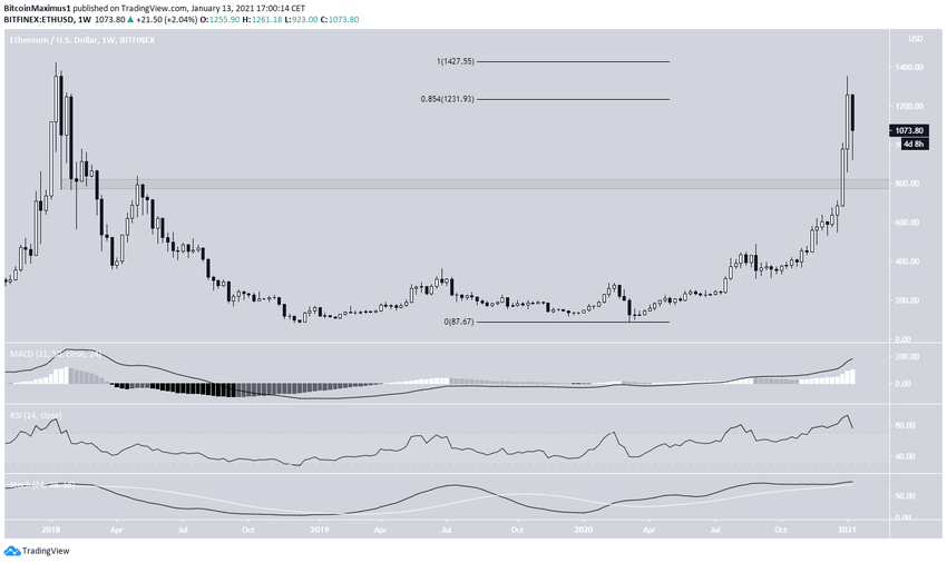 Wykres tygodniowy pokazuje, że ETH prawie osiągnął nowy rekord wszech czasów w dniu 10 stycznia, ale został odrzucony przez poziom zniesienia 0,854 Fib. To jest ostateczny obszar oporu przed historycznym ATH.