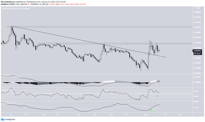 Para ETH/BTC obrazuje wybicie powyżej opadającej linii oporu, która istniała od września 2020 r., a następnie jej potwierdzenie.