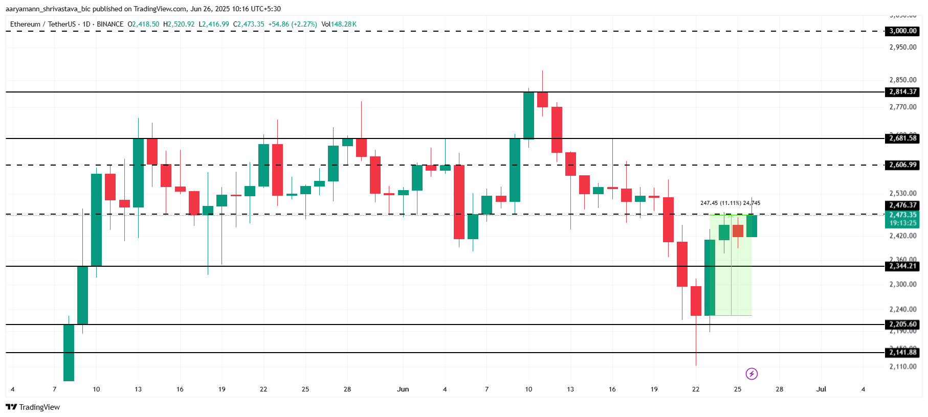Cena Ethereum wzrosła o 11% w tym tygodniu i handlowała na poziomie 2473 USD w momencie pisania. Altcoin próbuje przekształcić opór na poziomie 2476 USD we wsparcie, aby utrwalić ostatnie zyski. Zabezpieczenie tego poziomu byłoby kluczowe dla utrzymania obecnie trwającej, wzrostowej trajektorii Ethereum i budowy zaufania inwestorów w krótkim okresie.