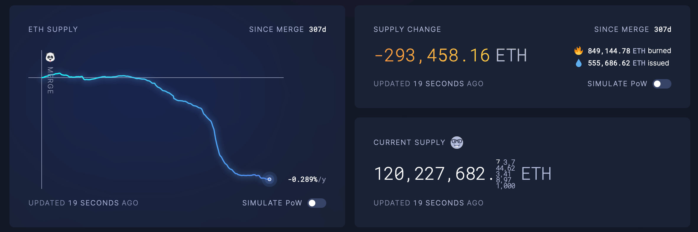 Jednocześnie całkowita podaż eterów nadal spada. W ciągu ostatniego tygodnia ich liczba zmniejszyła się o 3290 jednostek. Od dnia przejścia na PoS, czyli 15 września 2022 r. liczba monet w obiegu zmniejszyła się o 293 tysiące ETH.
