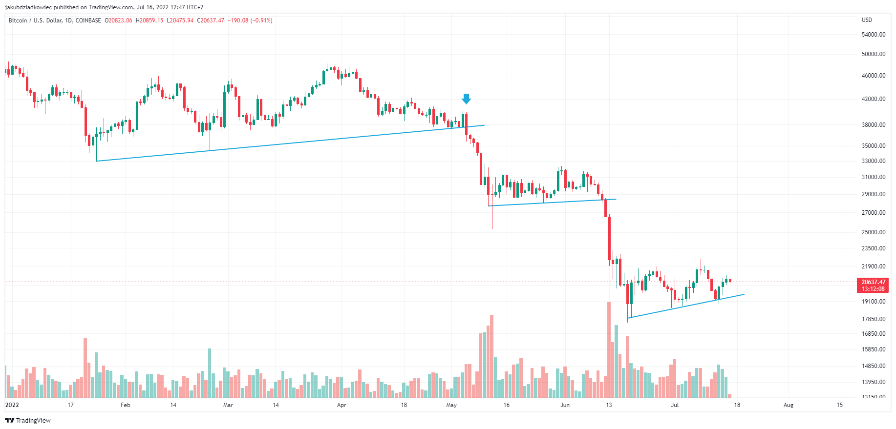 Gwałtowne załamanie nastrojów na rynku kryptowalut nastąpiło w dniu 5 maja. Wówczas Bitcoin utracił wsparcie na poziomie 38 000 USD i załamał się poniżej rosnącej linii wsparcia (niebieska). W dniu 12 maja odnotował dołek na poziomie 25 228 USD i rozpoczął konsolidację powyżej kolejnej linii wsparcia.
