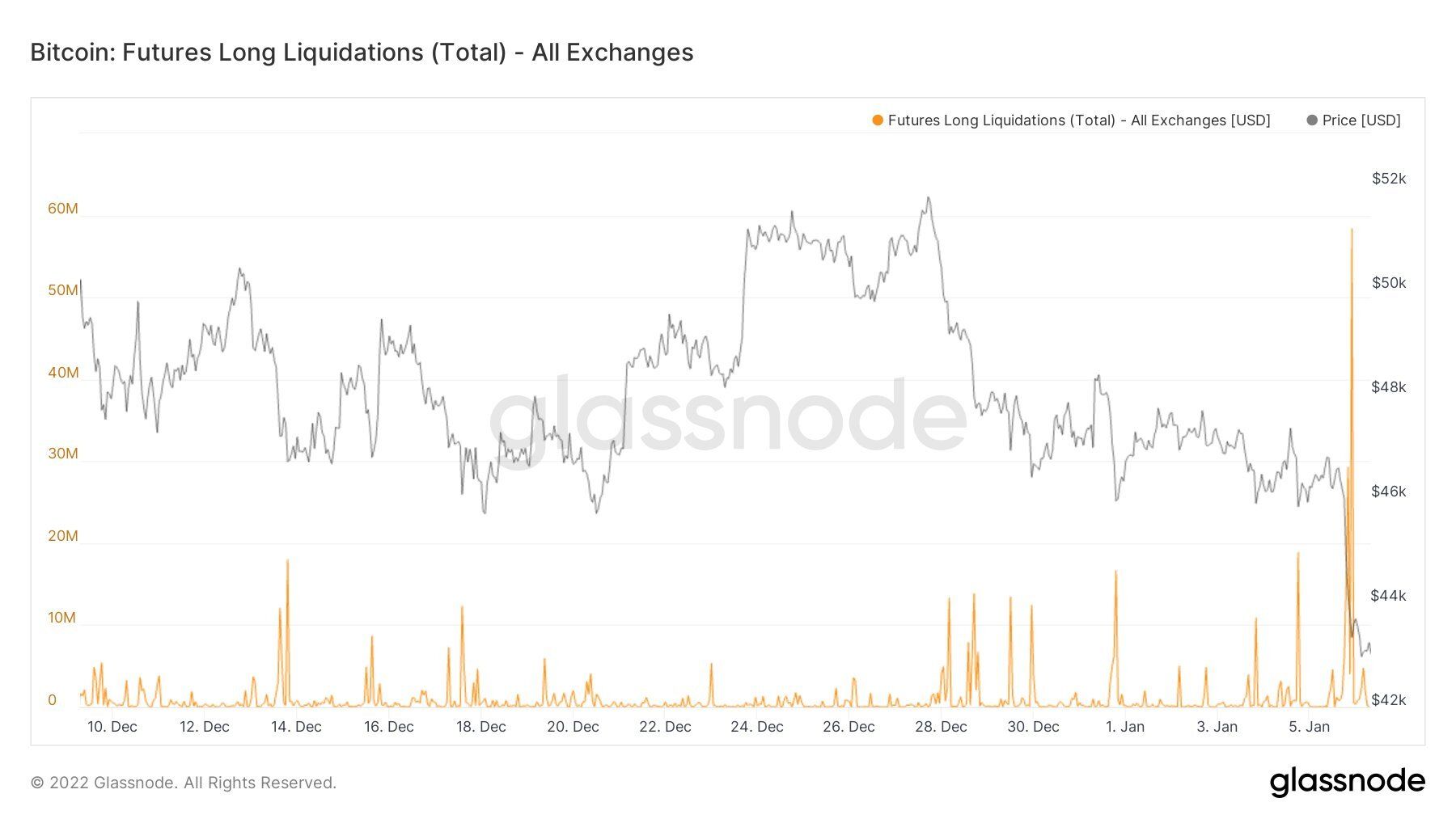 Tylko na rynku futures BTC likwidacje wyniosły 318 mln USD. Spośród nich aż 88% było pozycjami długimi. Najbardziej prawdopodobną przyczyną pogłębionego spadku była kaskadowa likwidacja pozycji długich po utraceniu przez BTC wsparcia w okolicach 45 500 USD. Od tego wydarzenia minęły Bitcoin odnotował dołek na 42 500 USD w zaledwie 4 godziny.