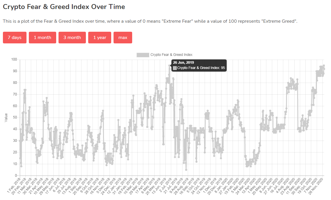 Od 15 dni cena Bitcoina konsoliduje się w dużym zakresie od nieco powyżej 16 000 USD do granic aktualnego ATH tuż poniżej 20 000 USD. W tym czasie popularny Fear and Greed Index utrzymuje się na rekordowo wysokim poziomie ekstremalnej chciwości w przedziale 86-95.