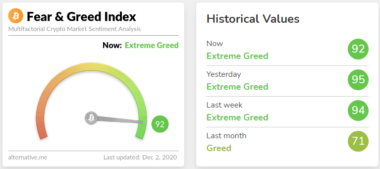 Jak donosiliśmy w BeInCrypto Polska Fear and Greed Index wkroczył w obszar ekstremalnej chciwości w dniu 6 listopada, osiągnął wartość 90 i od tamtej pory nie zwalnia. Co ciekawe, wartość wskaźnika nie zanurkowała nawet, gdy cena Bitcoina doświadczyła krótkiej, lecz głębokiej korekty i w dniu 26 listopada spadła o około 3000 USD, na krótko testując obszar 16 200 USD. Wartość wskaźnika ledwie drgnęła i odnotowała poziom 86, utwierdzając graczy rynkowych w silnym byczym sentymencie.