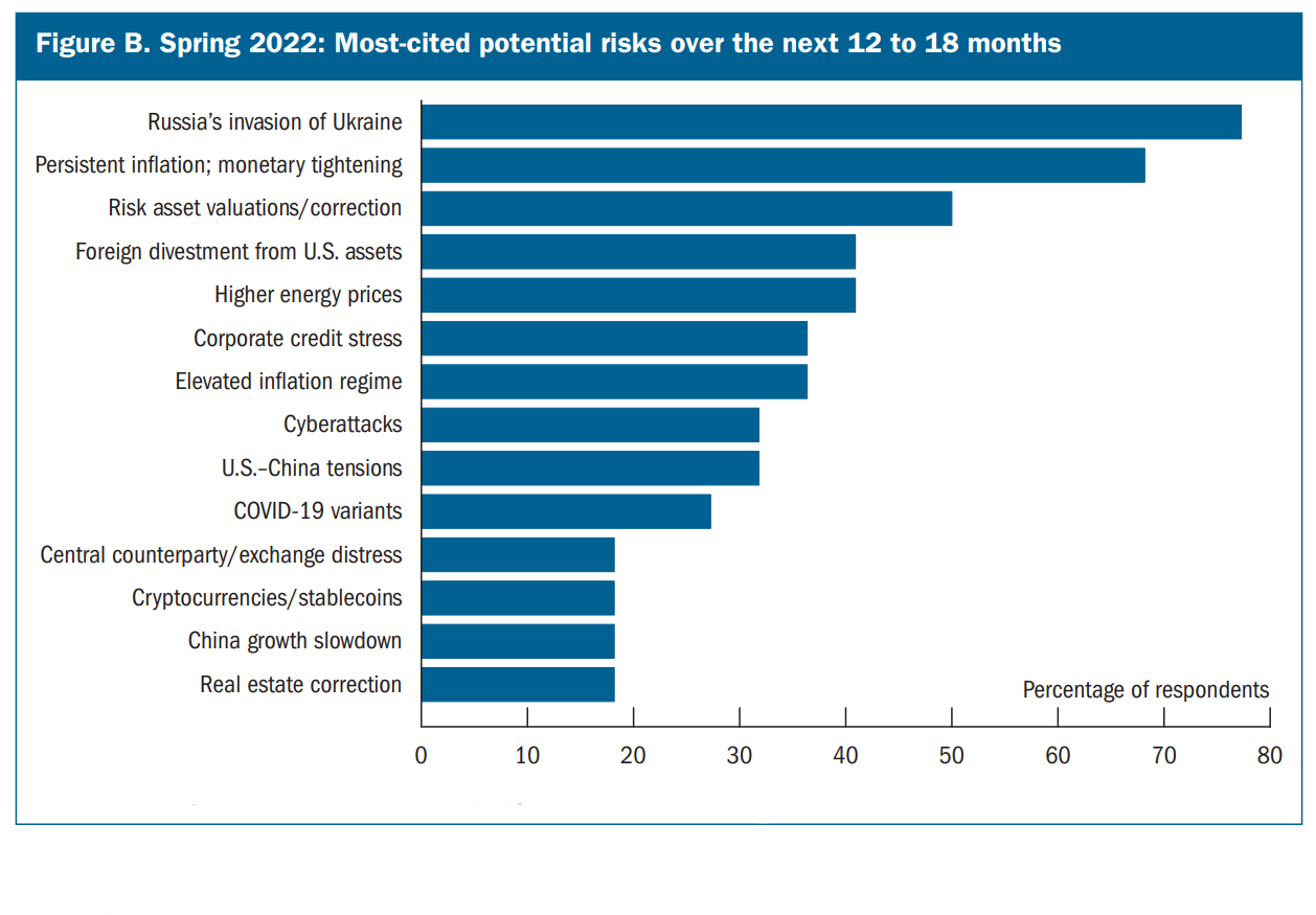 Bank Rezerwy Federalnej w Nowym Jorku, jeden z 12 banków rezerwy federalnej Stanów Zjednoczonych, zorganizował badanie. Wykazało ono, że obecnie istnieje 11 czynników, które stanowią większe ryzyko dla stabilności finansowej niż Bitcoin. Obecnie największym ryzykiem dla amerykańskiej gospodarki jest inwazja Rosji na Ukrainę, gwałtownie rosnąca inflacja oraz ryzyko kolejnej korekty na rynku akcji.