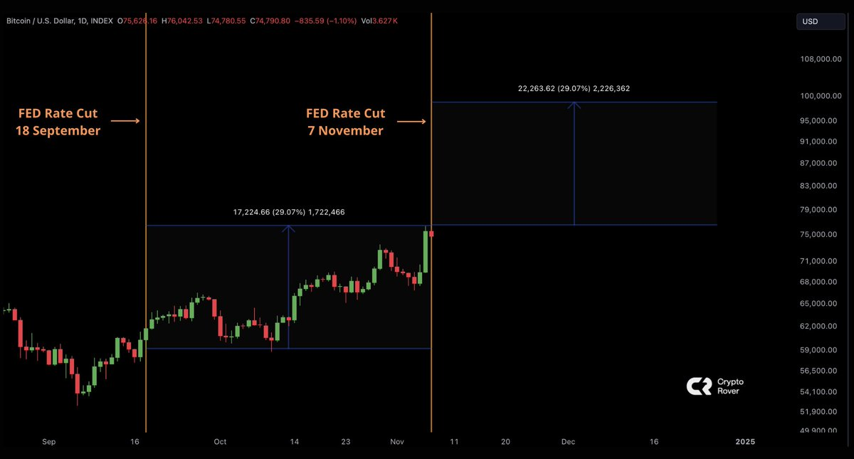Cena Bitcoina już osiągnęła nowy rekord wszech czasów od czasu zwycięstwa wyborczego Donalda Trumpa. Jednak nowe cięcie stóp może dodatkowo wzmocnić nastroje bycze. Rzeczywiście, w czwartek Bitcoin osiągnął kolejne ATH na poziomie 76 800 USD. Jednak w chwili pisania tego tekstu, Bitcoin nieco się cofnął, obecnie handlując po 75 800 USD.