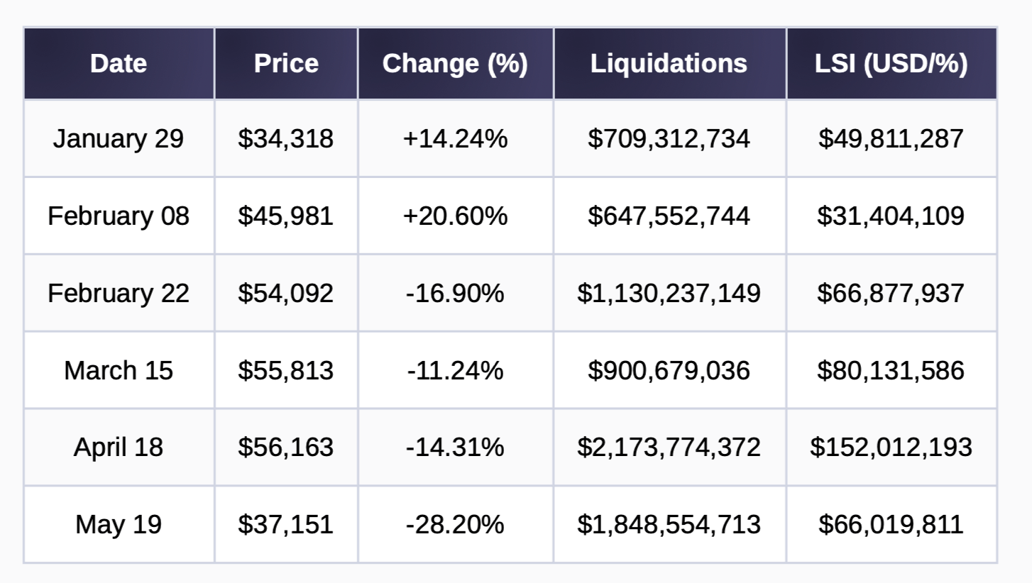 Jako przykład eksperci podają dane dotyczące największych dziennych zmian ceny Bitcoina, wolumenu zlikwidowanych pozycji oraz wolumenu zlikwidowanych pozycji na procent ceny (LSI) w 2021 roku.