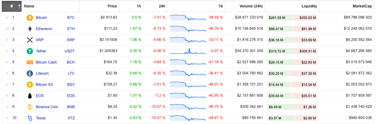 Bitcoin oraz największe kryptowaluty również ucierpiały. Cena BTC w momencie pisania tego tekstu jest poniżej poziomu 5 tysięcy USD. Ceny najważniejszych altcoinów są również niższe, a w przypadku Ethereum (ETH) prawie o 10%.