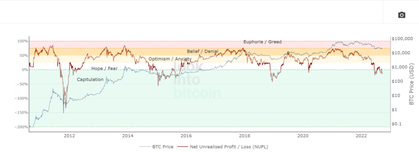 Patrząc na aktualne statystyki niezrealizowanych zysków/strat netto (NUPL), widać wyraźnie, że obecny klimat rynkowy jest w stanie kapitulacji po przedłużającej się bessie. NUPL reprezentuje dane w łańcuchu, które pokazują, czy rynek jest w stanie zysku czy straty. Jest to obliczane poprzez podzielenie względnych niezrealizowanych zysków przez względne niezrealizowane straty. Dopóki wykres jest poniżej zera, klimat jest obecnie w stanie kapitulacji. Obecnie NUPL wynosi -10% w momencie pisania.
