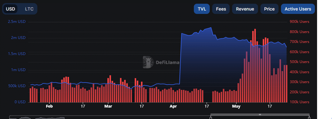 SponsoredCałkowita wartość Litecoina zablokowanego na platformach DeFi również znacznie spadła w porównaniu do majowego maksimum. Czerwone słupki na poniższym wykresie oznaczają liczbę aktywnych użytkowników, a niebieskie wartość zablokownych LTC w DeFi.