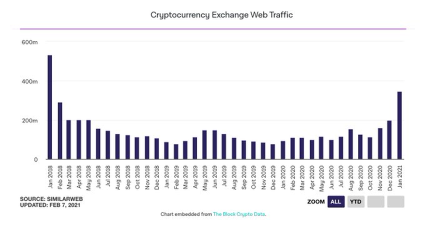 Dane z SimilarWeb ujawniają, że liczba osób odwiedzających giełdy kryptowalut wzrosła w styczniu 2021 roku do 344 milionów.