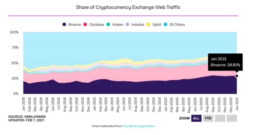 Trzy wiodące giełdy kryptowalut pod względem liczby odwiedzających to Binance, Coinbase i Kraken. Należąca do Changpeng Zhao Binance odpowiada za 28,8% odwiedzin, przy stosunkowo stabilnej aktywności użytkowników w ostatnich miesiącach.