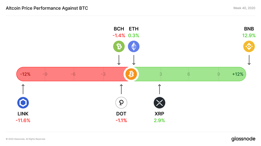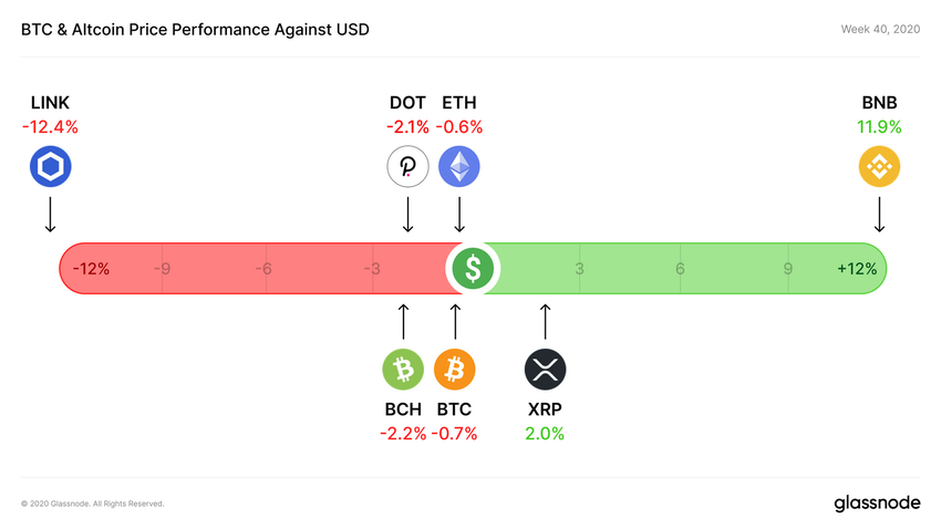 Najnowszy raport tygodniowy Glassnode rozpoczyna się od wskazania na niewielką zmianę ceny Bitcoina. Otwarcie tygodnia było na poziomie 10 730 USD, a zamknięcie na 10 650 USD. Podkreślony jest gwałtowny spadek z dnia 1 października, skorelowany z pesymistycznymi doniesieniami o giełdzie BitMEX i dignozie COVID-19 u Donalda Trumpa.