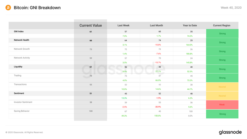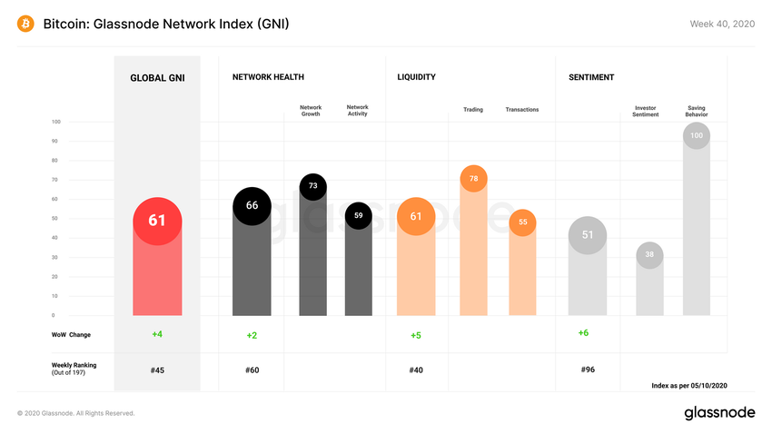 Pomimo tych wydarzeń wartość głównego wskaźnika GNI (Glassnode Network Index) uległa poprawie w stosunku do poprzedniego tygodnia. GNI zyskał 4 punkty i aktualnie wskazuje liczbę 61. Wszystkie 3 główne kategorie zyskały: