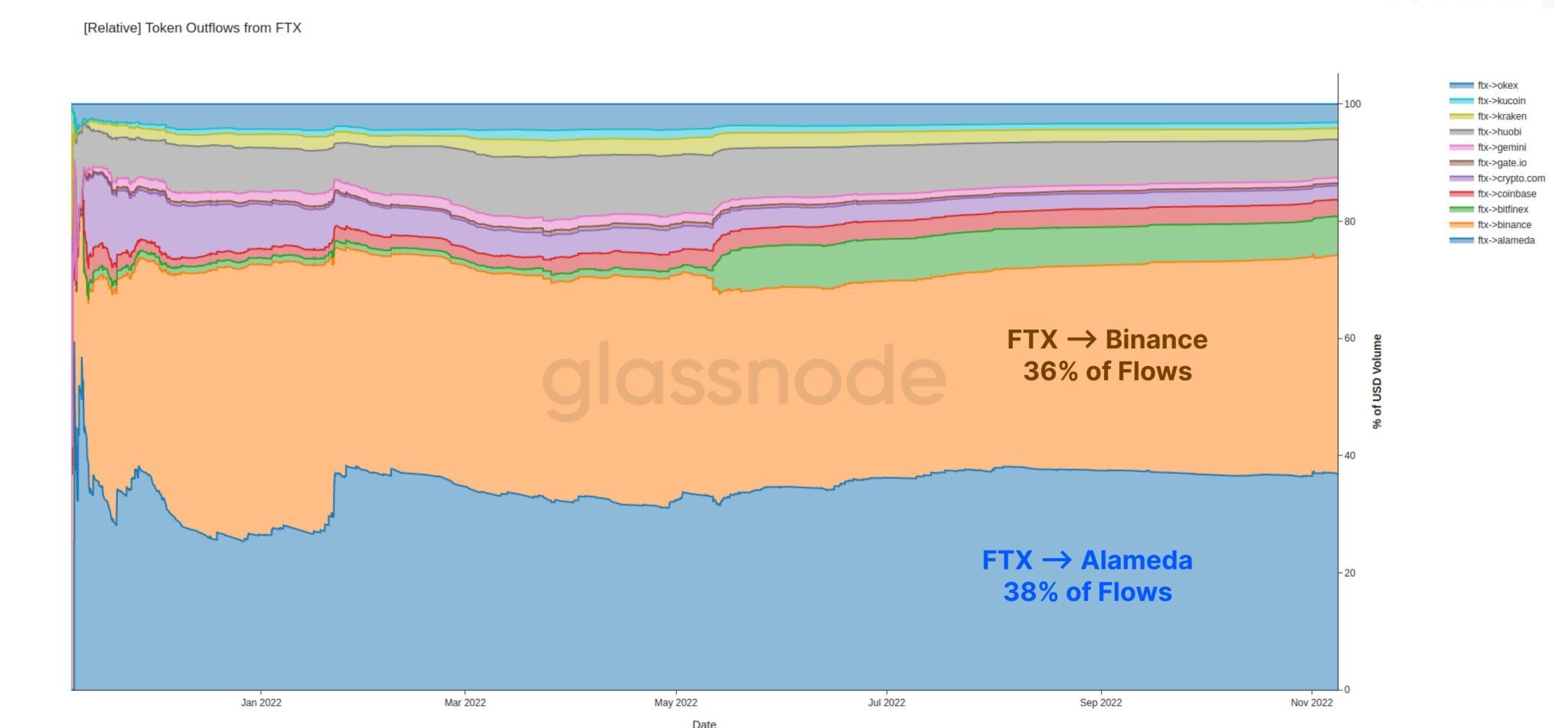 Alameda Research i Binance zostały również ocenione jako dominujące pod względem środków przepływających z FTX na inne platformy giełdowe. Stanowiły one odpowiednio 38% i 36%.