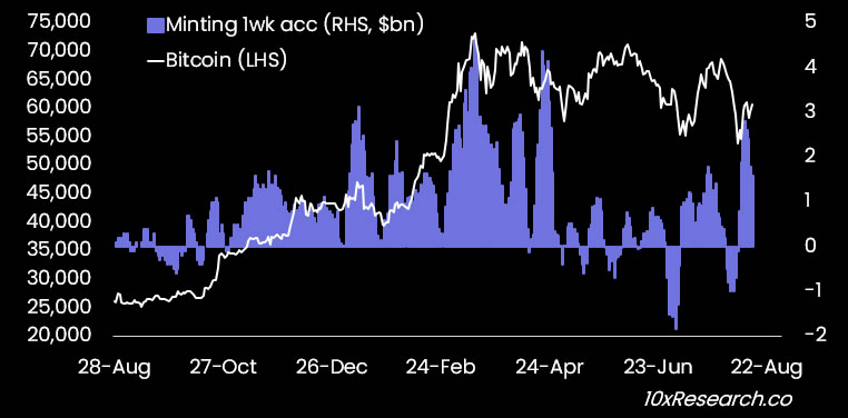 Oprócz regulacji, kolejną kluczową siłą dla ruchu w górę rynku jest wystarczająca ilość stablecoinów. Te są najczęściej wykorzystywane do zakupu innych krypto. Obecnie ilość stablecoinów w obiegu ze względu na napływ nowego kapitału do branży rośnie. Tylko w ciągu ostatniego tygodnia dwaj najwięksi emitenci – Tether i Circle wyemitowali około 2,8 miliarda dolarów w nowych stablecoinach.