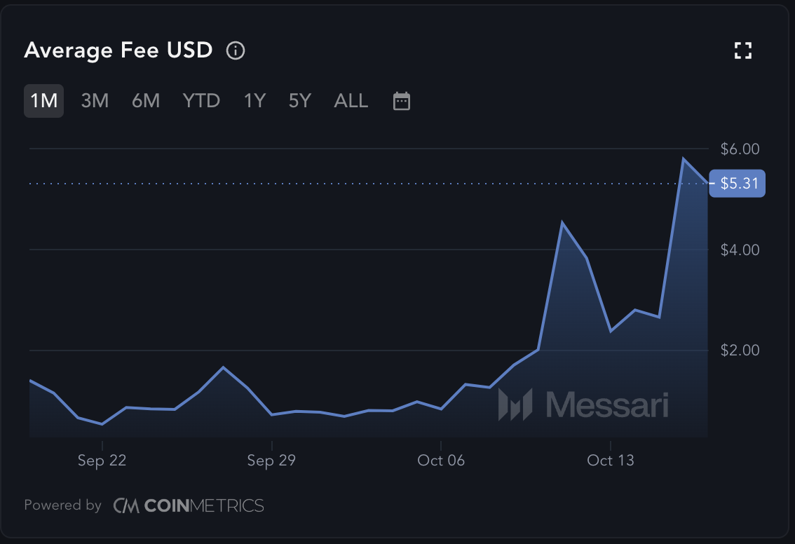Ostatni wzrost przychodów górników Bitcoina jest bezpośrednio związany z gwałtownym wzrostem średnich opłat transakcyjnych w sieci. Dane od Messari pokazują, że średnia opłata za przetwarzanie transakcji w sieci wzrosła o 166% w ciągu ostatnich siedmiu dni. Według dostawcy danych on-chain, obecnie wynosi ona 5,31 USD.