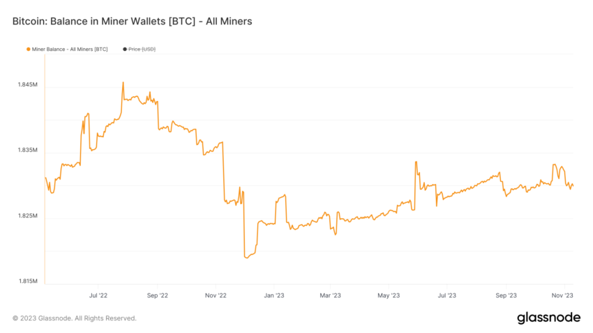 Potwierdzając te dane, Glassnode donosi o zauważalnym zmniejszeniu zasobów Bitcoinów wszystkich górników. Od 23 października, kiedy to stan posiadania wynosił 1,833 mln, liczba ta spadła do 1,829 mln do 7 listopada.