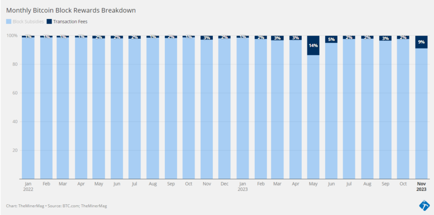 Według danych od TheMinerMag, górnicy Bitcoina zarobili w tym miesiącu około 830 BTC w opłatach transakcyjnych o wartości 30,7 mln USD. Stanowi to 9% miesięcznych nagród górników i jest najwyższym wynikiem od maja.