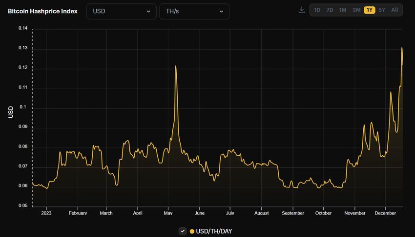 Niemniej jednak, górnicy Bitcoin będą mieli szczęśliwy okres świąteczny. Rentowność, czyli cena hasha, wzrosła do 19-miesięcznego maksimum, nawet wyższego niż ostatni szał na ordinale w maju.